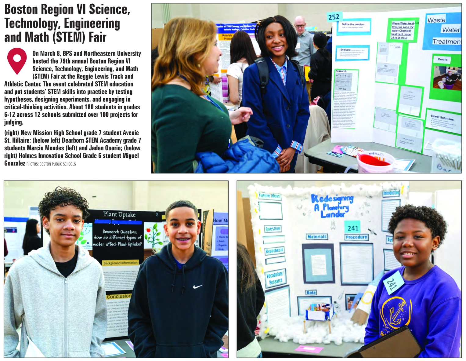 Boston Region VI Science, Technology, Engineering and Math (STEM) Fair On March 8, BPS and Northeastern University hosted the 79th annual Boston Region VI Science, Technology, Engineering, and Math (STEM) Fair at the Reggie Lewis Track and Athletic Center. The event celebrated STEM education and put students’ STEM skills into practice by testing hypotheses, designing experiments, and engaging in critical-thinking activities. About 180 students in grades 6-12 across 12 schools submitted over 100 projects for judging. (right) New Mission High School grade 7 student Avenie St. Hillaire; (below left) Dearborn STEM Academy grade 7 students Marcio Mendes (left) and Jaden Osorio; (below right) Holmes Innovation School Grade 6 student Miguel Gonzalez PHOTOS: BOSTON PUBLIC SCHOOLS