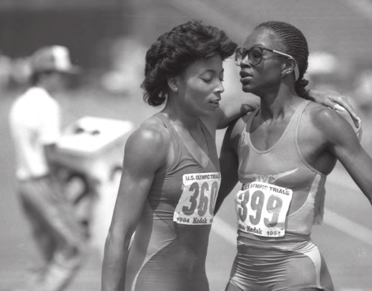 Florence Griffith Joyner (left) with Valerie Brisco-Hooks at the 1984 Olympic Trials.