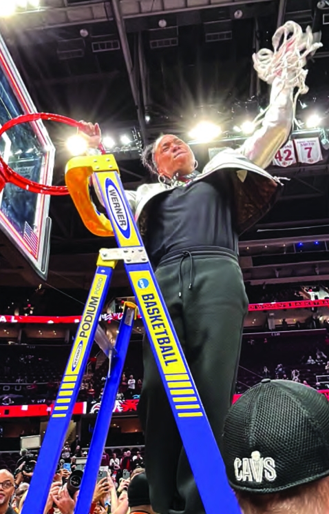 Gamecocks coach Dawn Staley cuts down the nets after a win.