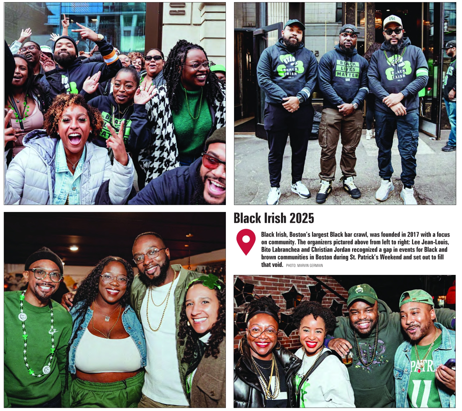 Black Irish, Boston’s largest Black bar crawl, was founded in 2017 with a focus on community. The organizers pictured above from left to right: Lee Jean-Louis, Bito Labranchea and Christian Jordan recognized a gap in events for Black and brown communities in Boston during St. Patrick’s Weekend and set out to fill that void. PHOTO: MARVIN GERMAIN