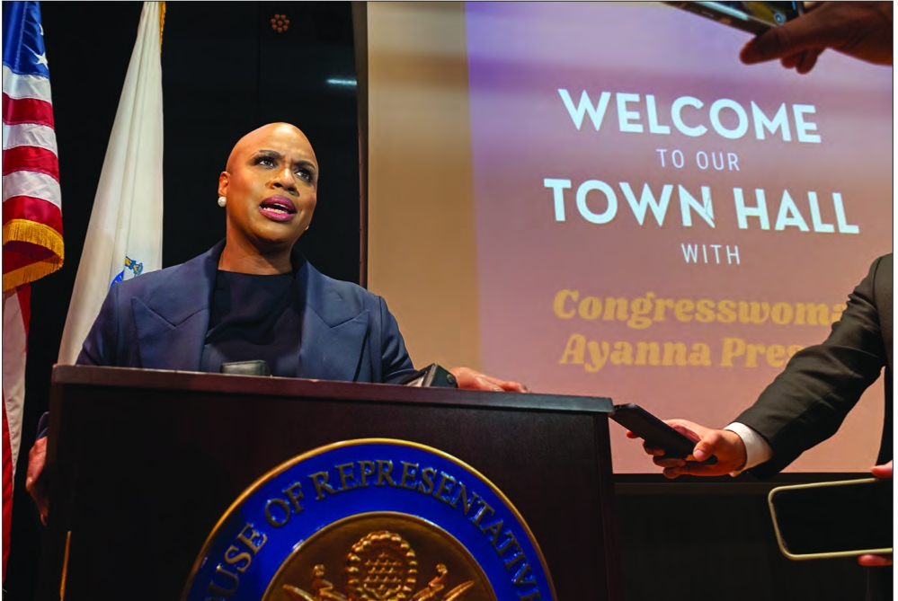In front of a packed crowd at Roxbury Community College, Rep. Ayanna Pressley joined constituents to present a vision for how she thinks the Democratic Party can push back against Republican control in both chambers of Congress and answer community questions in a tense political moment.