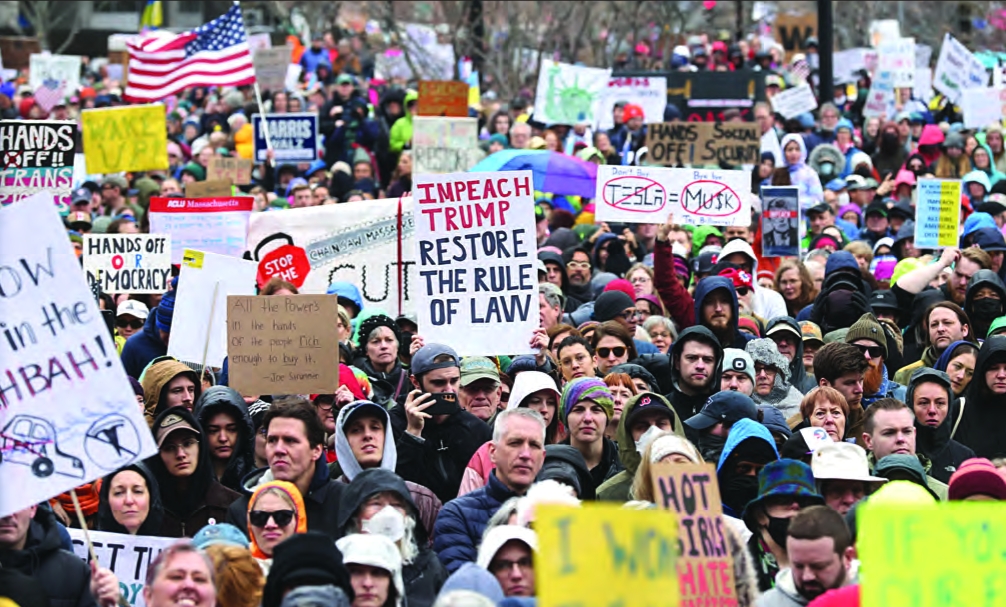 Thousands of protesters attend the April 5 “Hands Off Rally” in Boston Common. Organized by the Indivisible Mass Coalition, Mass 50501, Swing Blue Alliance, UU Mass Action and ACLU of Massachusetts, the event was part of a nationwide protest in opposition to President Donald Trump, DOGE leader Elon Musk, government downsizing, the economy, human rights and other issues. See also