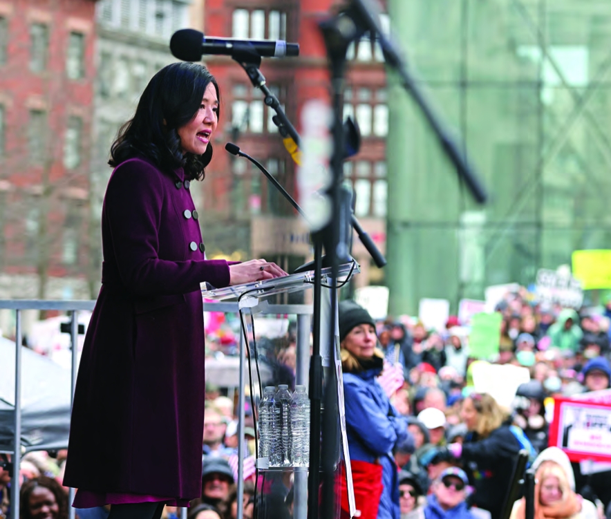 Wu, a Chicago native, who in her 2021 run for mayor faced criticism for being a carpet bagger, can now cast herself as the city’s chief defender. In her speech, she used the tagline “Here in Boston, we don’t back down” and used the word “fight” 11 times.