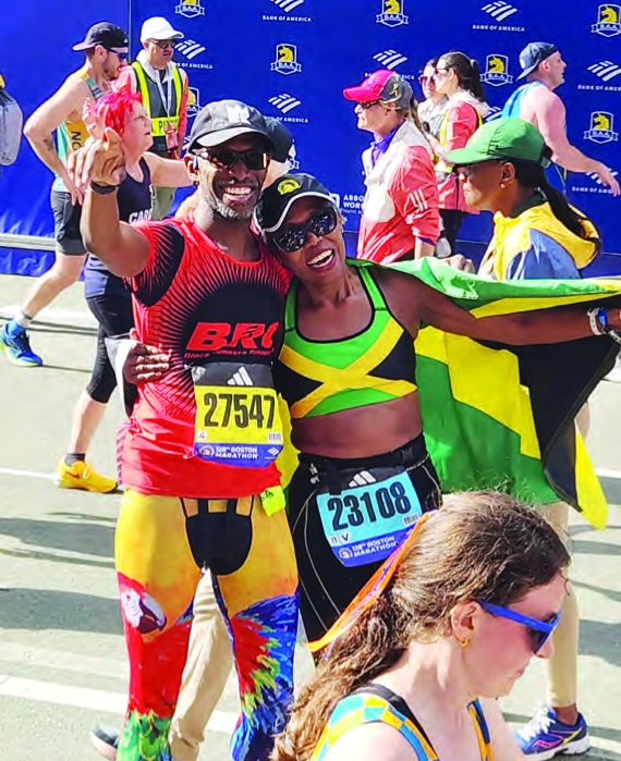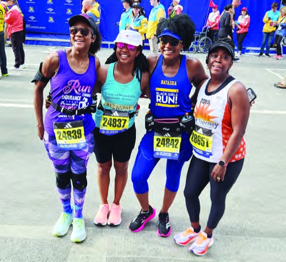 Two runners from Black Unicorn Marathoners celebrate at the finish line.