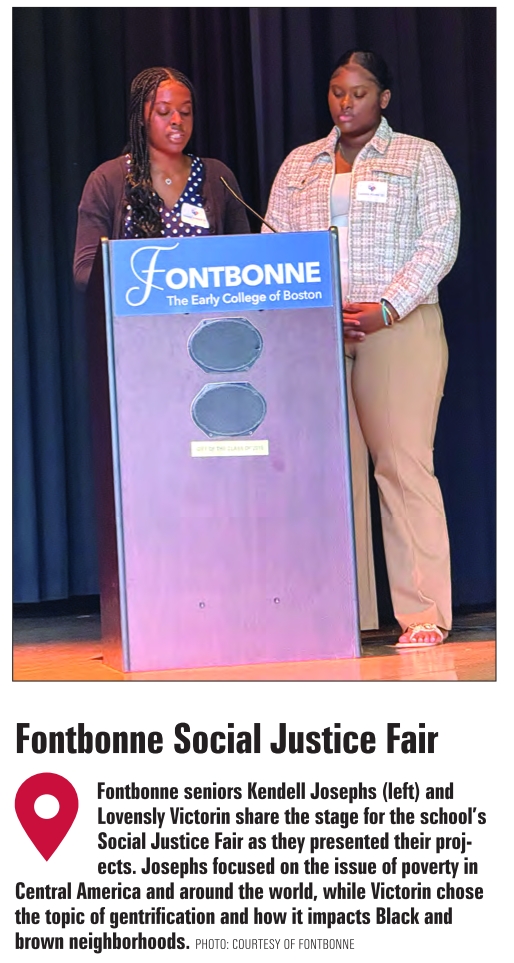 Fontbonne seniors Kendell Josephs (left) and Lovensly Victorin share the stage for the school’s Social Justice Fair as they presented their projects. Josephs focused on the issue of poverty in Central America and around the world, while Victorin chose the topic of gentrification and how it impacts Black and brown neighborhoods. PHOTO: COURTESY OF FONTBONNE
