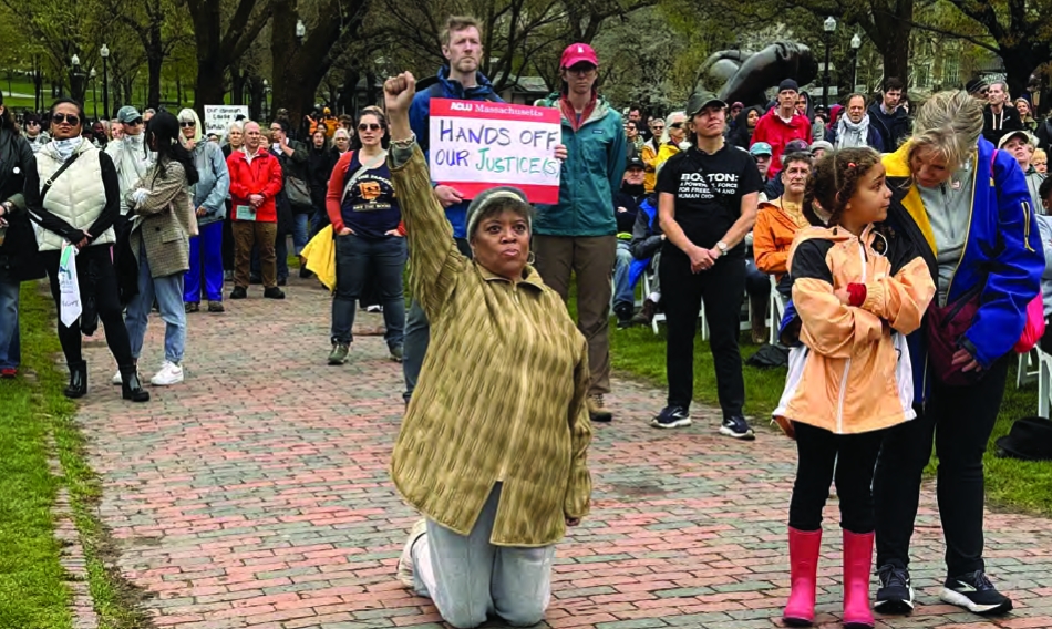 Doreen Wade, kneeling, at the 60th anniversary of the Freedom Rally on Boston Common on April 26, 2025.
