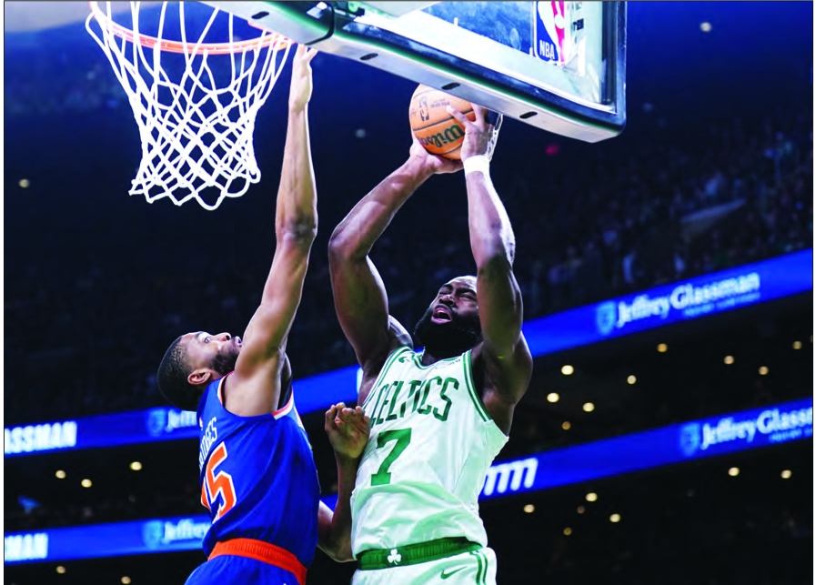 New York’s Mickell Bridges tries to stop The C’s Jaylen Brown at the basket.