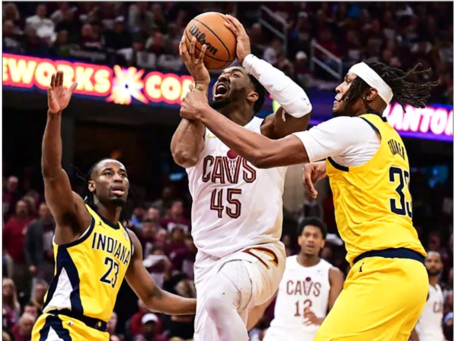 Cavalier forward Donovan Mitchell gets fouled by the Pacers’ Myles Turner.
