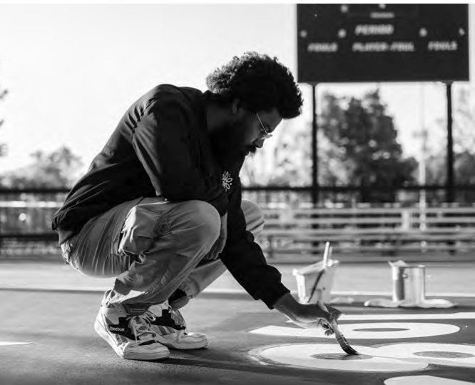 Michael Talbot at work on a basketball court mural at Malcolm X Park in Roxbury.