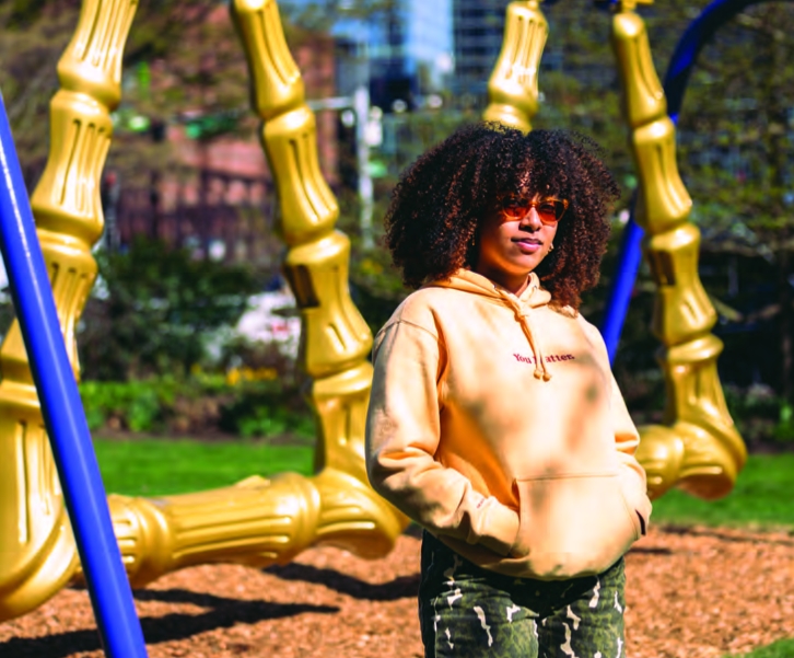 In designing the hoops as a playful swing set, Ortega wanted to encourage all park visitors, but especially the BIPOC women who are culturally connected to hoop earrings, to enjoy a moment of peace and play in a public space and to feel welcome in downtown Boston.