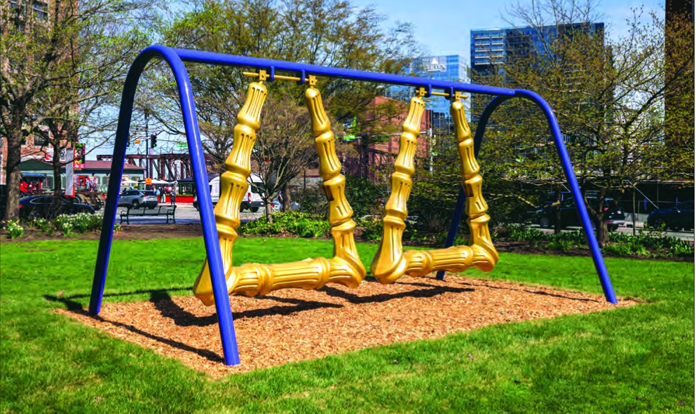 In designing the hoops as a playful swing set, Ortega wanted to encourage all park visitors, but especially the BIPOC women who are culturally connected to hoop earrings, to enjoy a moment of peace and play in a public space and to feel welcome in downtown Boston.