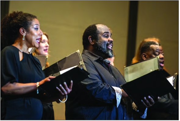 Countertenor Reginald Mobley with soprano Cassandra Extavour (left), baritone Dana Whiteside (left) and other H+H Chorus members.
