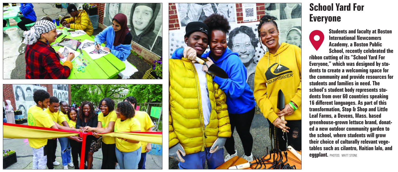 School Yard For Everyone Students and faculty at Boston International Newcomers Academy, a Boston Public School, recently celebrated the ribbon cutting of its “School Yard For Everyone,” which was designed by students to create a welcoming space for the community and provide resources for students and families in need. The school’s student body represents students from over 60 countries speaking 16 different languages. As part of this transformation, Stop & Shop and Little Leaf Farms, a Devens, Mass. based greenhouse-grown lettuce brand, donated a new outdoor community garden to the school, where students will grow their choice of culturally relevant vegetables such as cilantro, Haitian lalo, and eggplant. PHOTOS: MATT STONE See also