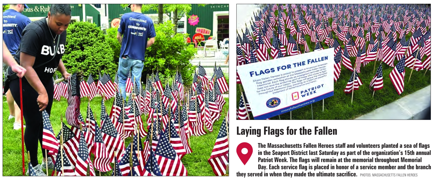 The Massachusetts Fallen Heroes staff and volunteers planted a sea of flags in the Seaport District last Saturday as part of the organization’s 15th annual Patriot Week. The flags will remain at the memorial throughout Memorial Day. Each service flag is placed in honor of a service member and the branch they served in when they made the ultimate sacrifice. PHOTOS: MASSACHUSETTS FALLEN HEROES