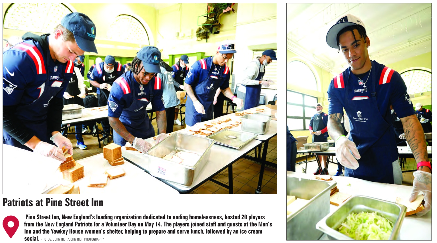 Patriots at Pine Street Inn Pine Street Inn, New England’s leading organization dedicated to ending homelessness, hosted 20 players from the New England Patriots for a Volunteer Day on May 14. The players joined staff and guests at the Men’s Inn and the Yawkey House women’s shelter, helping to prepare and serve lunch, followed by an ice cream social. PHOTOS: JOHN RICH/JOHN RICH PHOTOGRAPHY See also