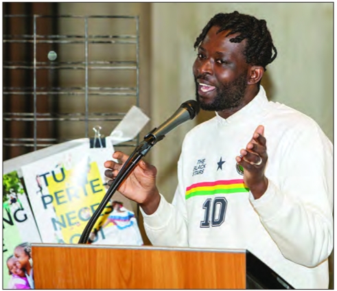 (above) Emmanuel Oppong-Yeboah, Boston poet laureate, speaks at City Hall during the launch of the “City of Belonging” festival, May 21. (below) “You Belong Here” banners hang in Boston City Hall.
