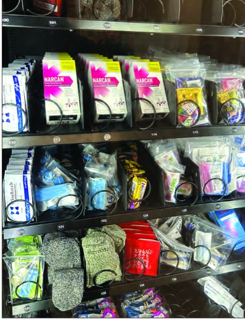 The contents of a new harm reduction vending machine are shown at the Boston Public Health Commission’s Recovery Services office in the Boston Medical Center Finland Building.