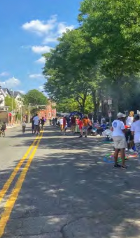 Residents trying to find shade and a cool place on Blue Hill Avenue during an Open Streets Day.