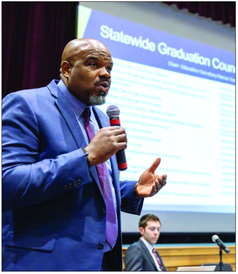 Education Secretary Patrick Tutwiler said the statewide graduation council is preparing recommendations that will be delivered to the governor and the Legislature by the end of the calendar year. He traced the set of standardized tests known as MCAS back to the 1993 Education Reform Act. The test, administered statewide by 1998, became the formal competency determination.