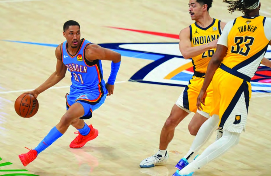 Thunder Guard Aaron Wiggins races past two Indiana defenders.
