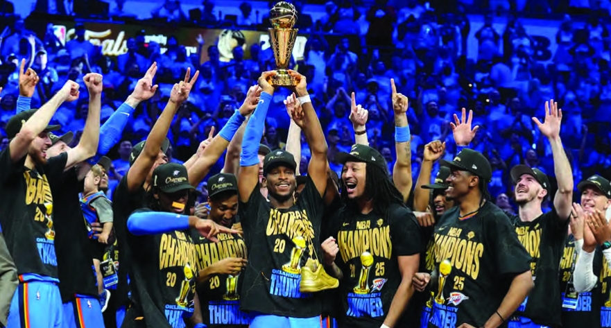 The Oklahoma City Thunder raise the Larry O’Brien Championship Trophy.The Oklahoma City Thunder concluded their run to their first National Basketball Association title in franchise history at home with a 103-91 triumph over the Indiana Pacers. This was the seventh and final game of this year’s league playoffs. The Thunder previously played in Washington state as the Seattle Supersonics, winning the 1979 championship.