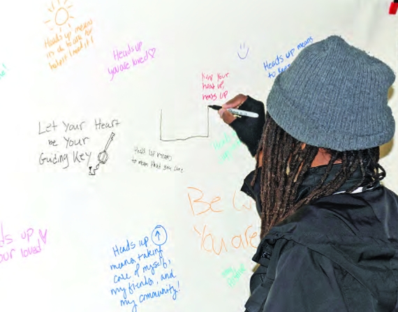 A teen signs a poster at the Heads Up Boston Pop-Up Shop downtown, Dec. 6. The Heads Up program, aimed at encouraging Boston youth to talk about their mental health, is one of a number of initiatives in a 5-year, $21 million effort launched to address youth mental health challenges by the Boston Public Health Commission in 2024, which have so far reached over 1,000 young people and trained over 300 new mental health practitioners and clinicians.