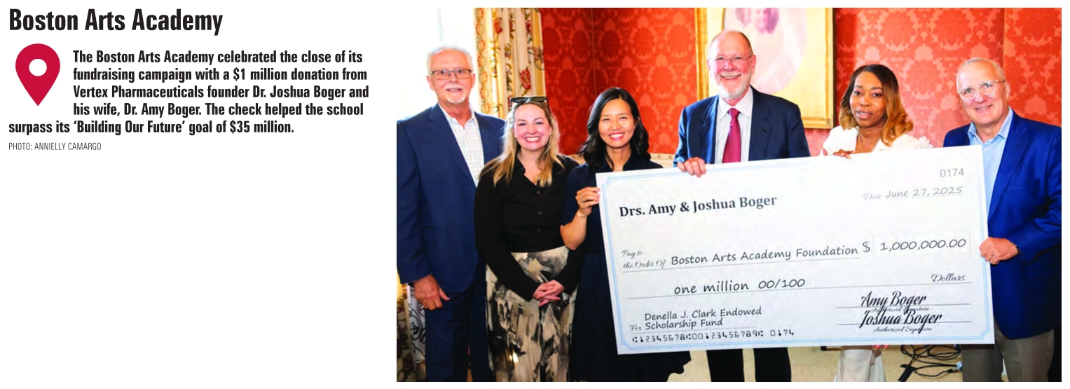 Boston Arts Academy The Boston Arts Academy celebrated the close of its fundraising campaign with a $1 million donation from Vertex Pharmaceuticals founder Dr. Joshua Boger and his wife, Dr. Amy Boger. The check helped the school surpass its ‘Building Our Future’ goal of $35 million. PHOTO: ANNIELLY CAMARGO See also