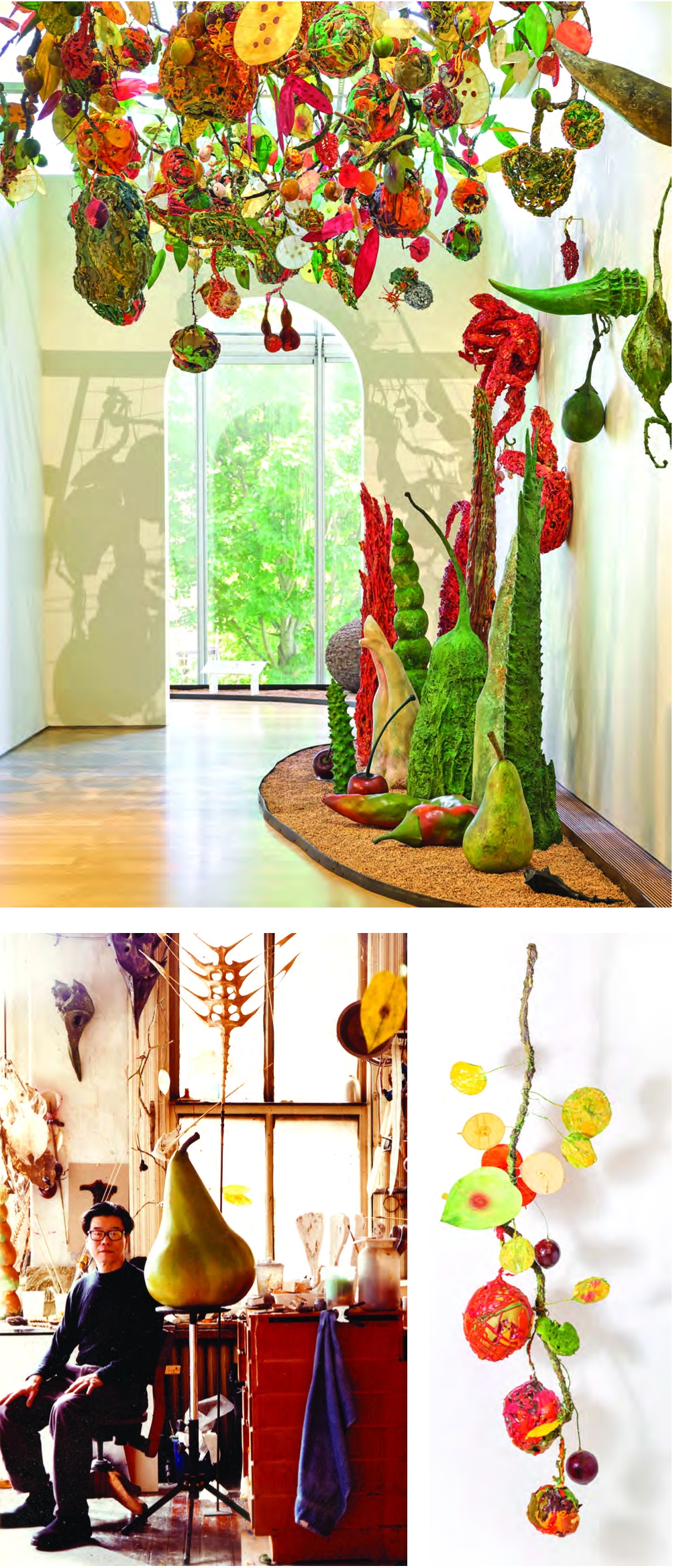Fay, who died in February, lived in New York City and his contemplation about gardens often took place within the context of an urban space. Some of the artworks, such as a large, sculpted maple twirler hung on a wall, are things Fay would see on the sidewalks. The large fruit and vegetable sculptures were inspired by vendors selling groceries in Chinatown. In other areas of the installation there are fantastical, imagined fruits and flowers that would be at home in science fiction.