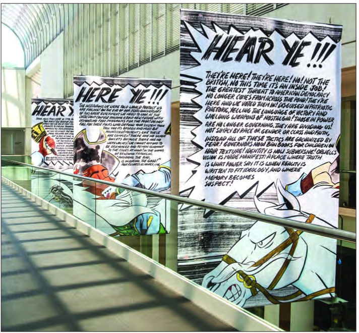 The three 10-foot-tall panels hanging at the MFA are inspired by the 250th anniversary of Paul Revere’s ride. One of the panels reads “They’re here! They’re here! No! Not the British, no, this time it’s an inside job! The greatest threat to American democracy no longer comes from across the pond!” The reverse of the panels shows a painting of the American flag but the stripes are harsh waves that are perhaps drowning the country’s people.