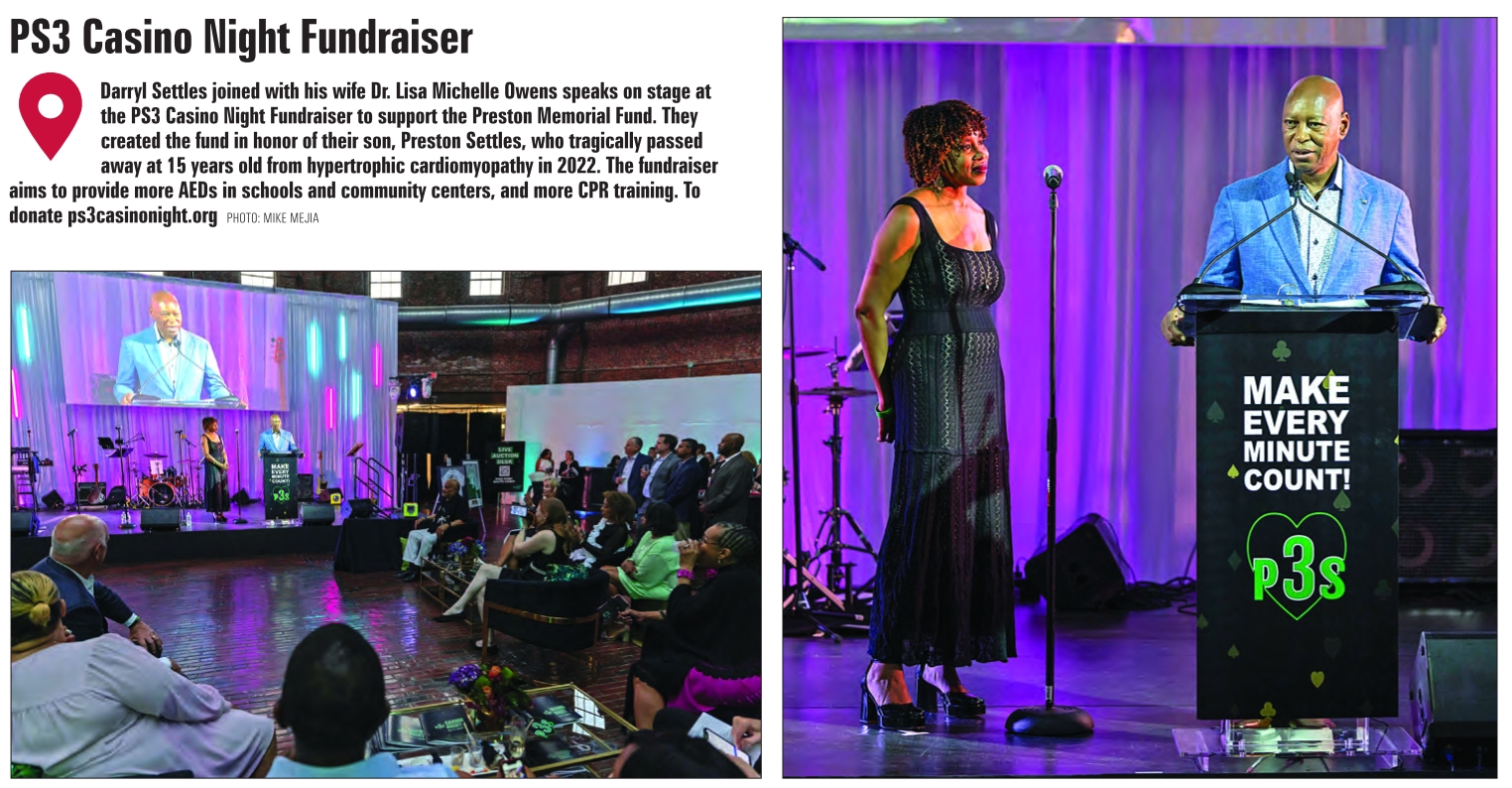 Darryl Settles joined with his wife Dr. Lisa Michelle Owens speaks on stage at the PS3 Casino Night Fundraiser to support the Preston Memorial Fund. They created the fund in honor of their son, Preston Settles, who tragically passed away at 15 years old from hypertrophic cardiomyopathy in 2022. The fundraiser aims to provide more AEDs in schools and community centers, and more CPR training. To donate ps3casinonight.org PHOTO: MIKE MEJIA
