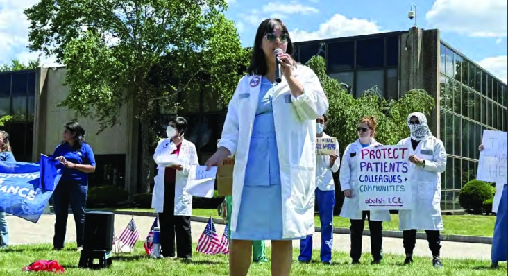 “Our coworkers, housekeepers, nursing assistants, and fellow residents don’t know if ICE will be at the hospital when they show up to work in the morning,” said Anisah Hashmi, a psychiatrist in her last year of residency and union member of the SEIU’s Committee of Interns and Residents.