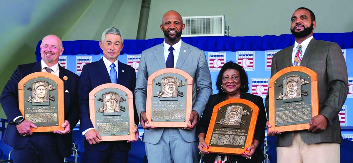 The Baseball Hall of Fame Class of 2025: (from left) Bily Wagner, Ichiro Suzuki, CC Sabathia, Willa Allen, widow of Dick Allen, and Dave Parker II, son of Dave Parker.