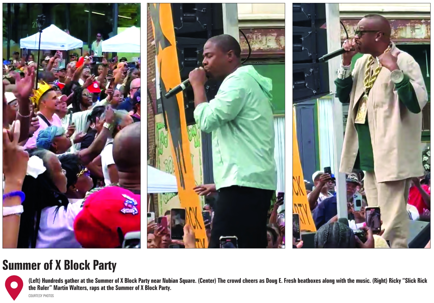 Summer of X Block Party (Left) Hundreds gather at the Summer of X Block Party near Nubian Square. (Center) The crowd cheers as Doug E. Fresh beatboxes along with the music. (Right) Ricky “Slick Rick the Ruler” Martin Walters, raps at the Summer of X Block Party. COURTESY PHOTOS
