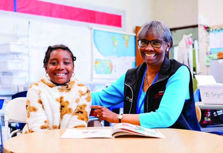 A Literations volunteer smiles alongside her student during a one-on-one tutoring session designed to boost early reading skills. The nonprofit trains community members to deliver high-dosage literacy support in under-resourced schools and after-school programs.