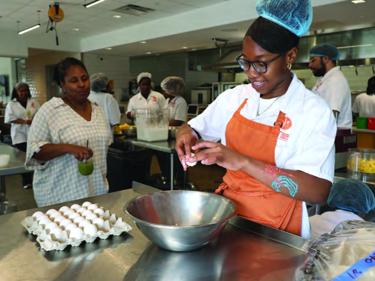 Chefs student Melia prepares a batch of eggs in the kitchen to be used