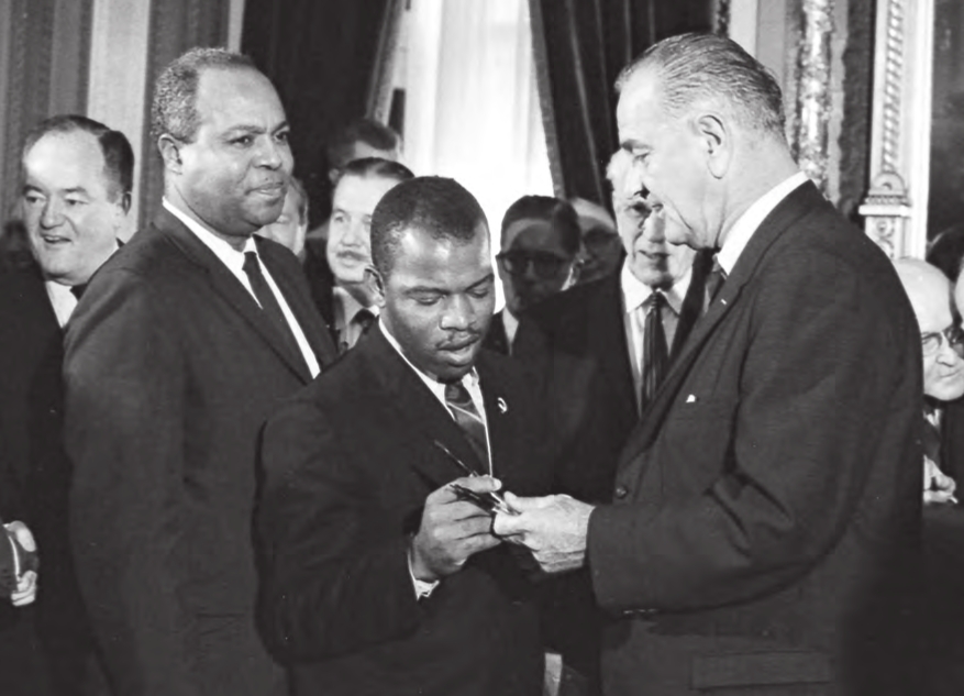 Lyndon Johnson hands a signing pen to civil rights activist John Lewis