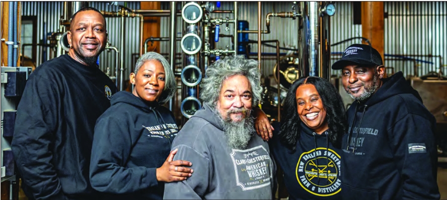 A family affair: Sisters Nilaja Young, left, and Alisa Lawrence, right, along with their spouses Karl Lawrence and Kenny Young, pose with their uncle Robert Patton-Spruill, center, founder of New England Sweetwater Farm & Distillery, Left: New England Sweetwater Farm & Distillery in Winchester, N.H.