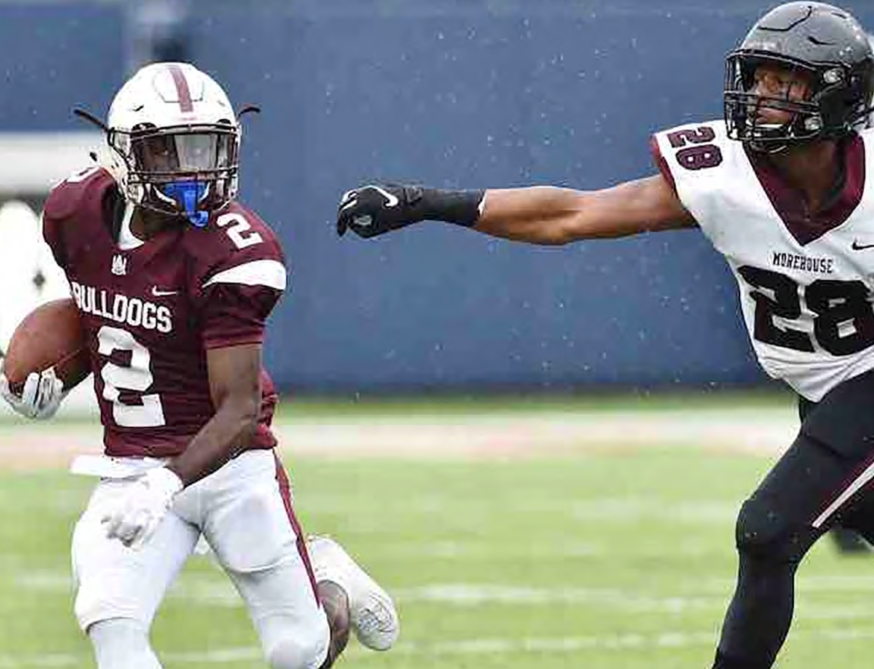 A Morehouse defensive back runs down an Alabama A&M Bulldog.