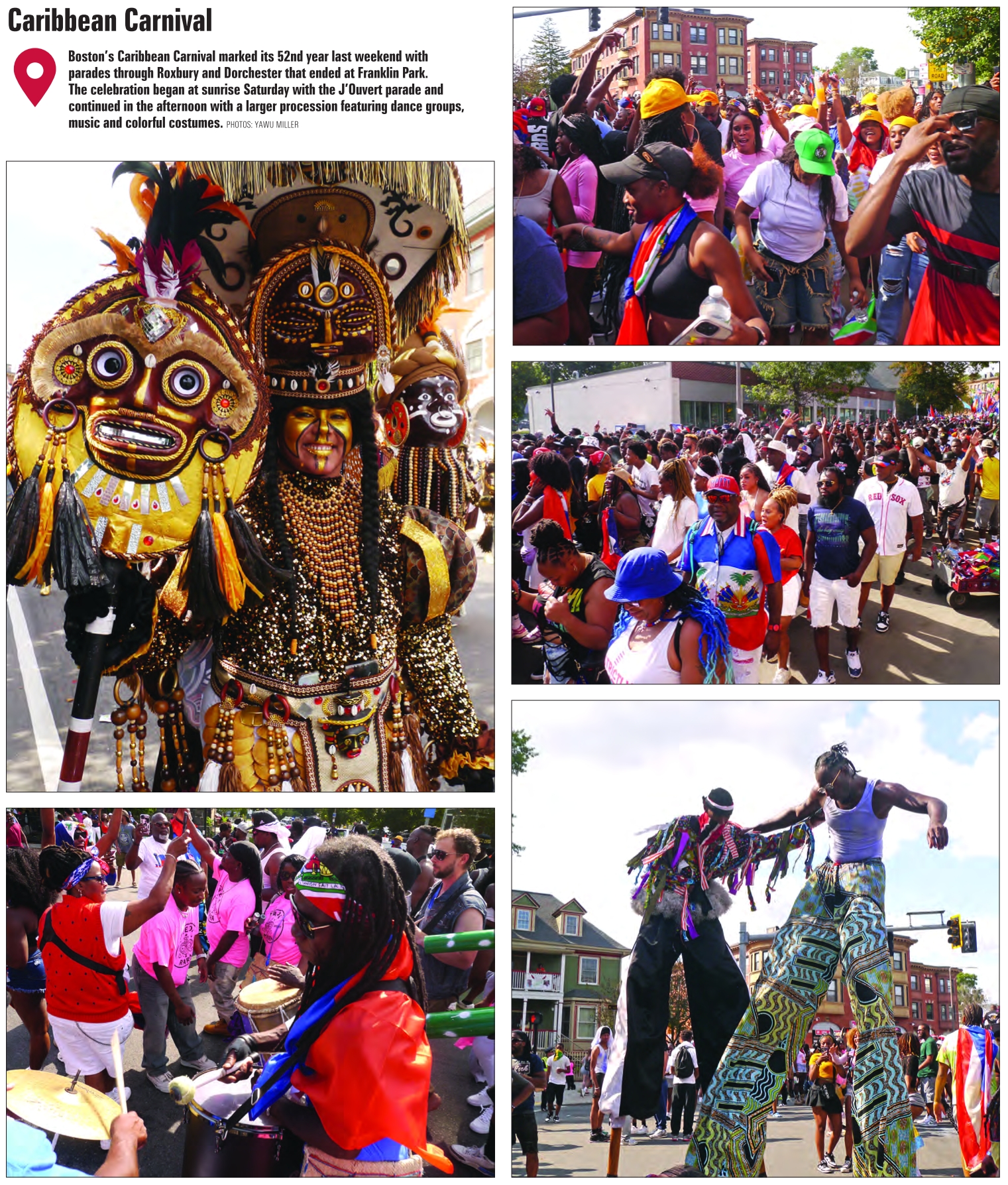 Caribbean Carnival Boston’s Caribbean Carnival marked its 52nd year last weekend with parades through Roxbury and Dorchester that ended at Franklin Park. The celebration began at sunrise Saturday with the J’Ouvert parade and continued in the afternoon with a larger procession featuring dance groups, music and colorful costumes. PHOTOS: YAWU MILLER See also
