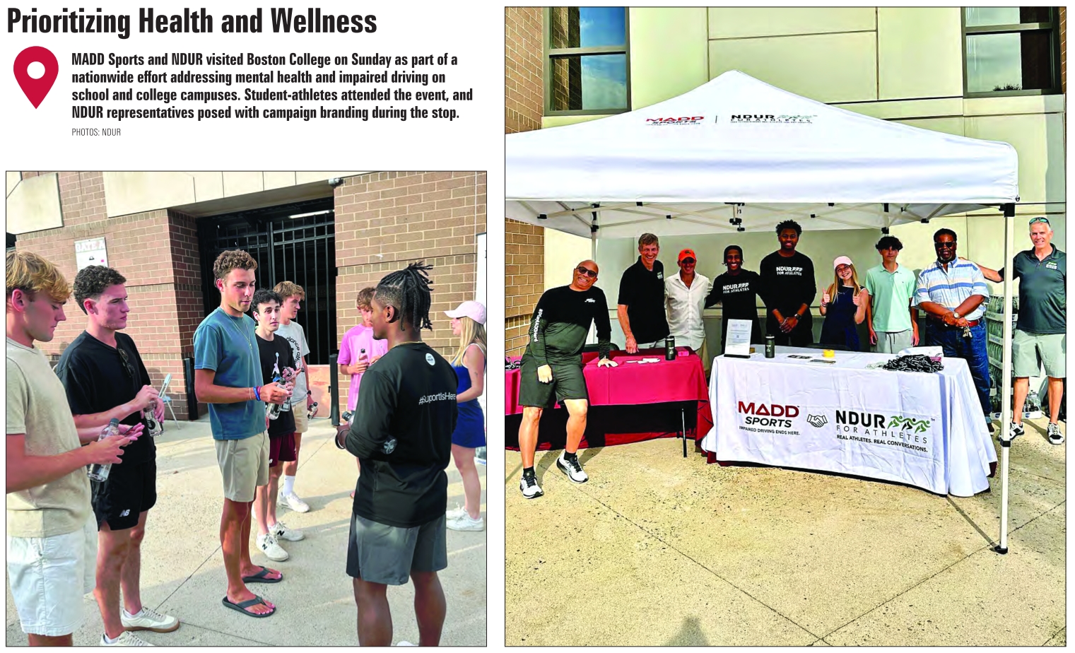 MADD Sports and NDUR visited Boston College on Sunday as part of a nationwide effort addressing mental health and impaired driving on school and college campuses. Student-athletes attended the event, and NDUR representatives posed with campaign branding during the stop.
