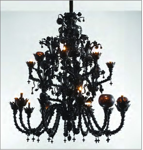 With this research as a foundation, Wilson began making intricate Murano glass, a famed product of beauty in Venice, in a deep black color. Typically presented in bright, colorful hues, the glass takes on a very different tone when produced in black. “Act V. Scene II —Exeunt Omnes, 2014” is a large 10-foot black mirror with a beautifully appointed trim and four different sections. Looking through it, the gallery reflected behind the viewer looks like a completely different world, a parallel
