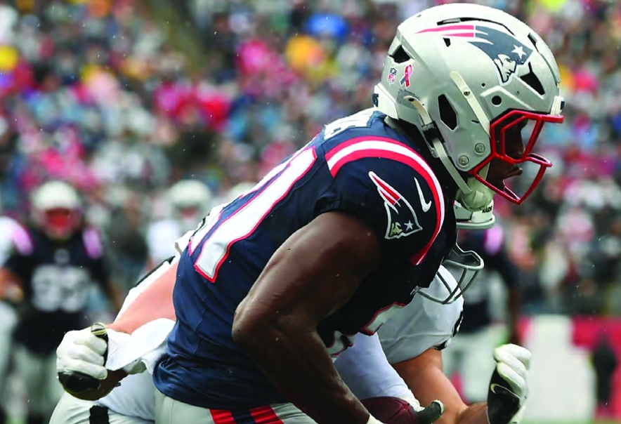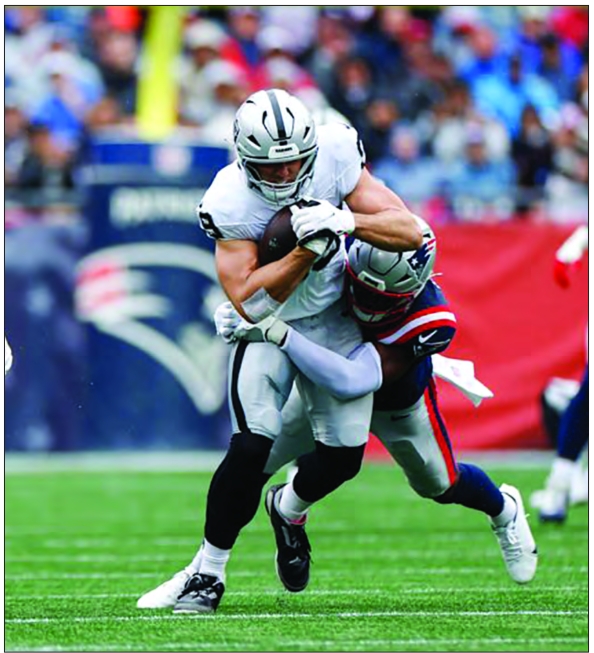 Raiders Tight End, Brock Bowers, hauls in a catch against the Patriots in Foxborough.