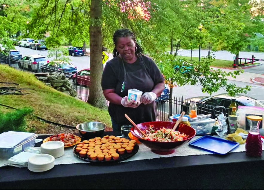 Michelle Carter (Chef Michelle) serves honey cupcakes, salad and juice at the Urban Agriculture Fair.A warm breeze, the sweetness of freshly extracted honey, and poetry floated through the Peace Garden at First Church in Roxbury on the evening of Sept. 11.