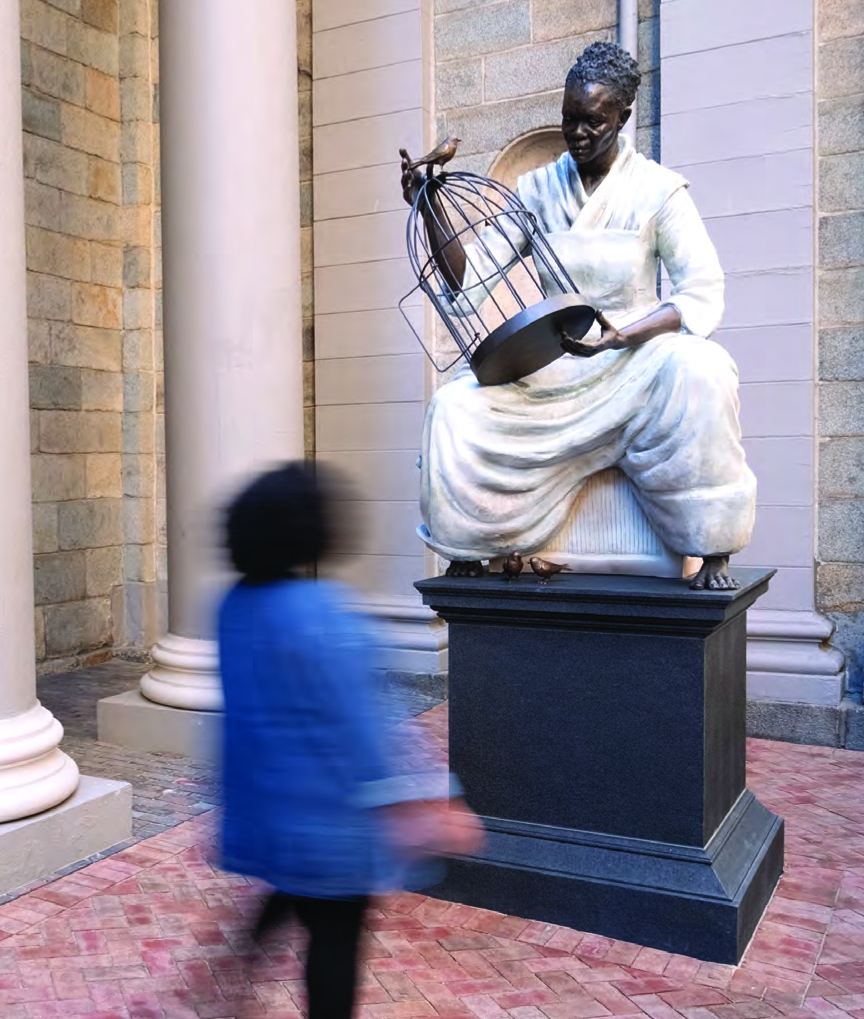 King’s Chapel has stood on the corner of Tremont and School streets since 1686. It’s one of the oldest churches in Boston and one of the 16 official stops on the Freedom Trail. But as of Sept. 14, the facade of the imposing stone church will look a little different. On its south terrace, passersby will now spot a larger-than-life statue of a Black woman. Draped in regal white, she sits on a pedestal holding a metal cage and from that cage, birds fly free.