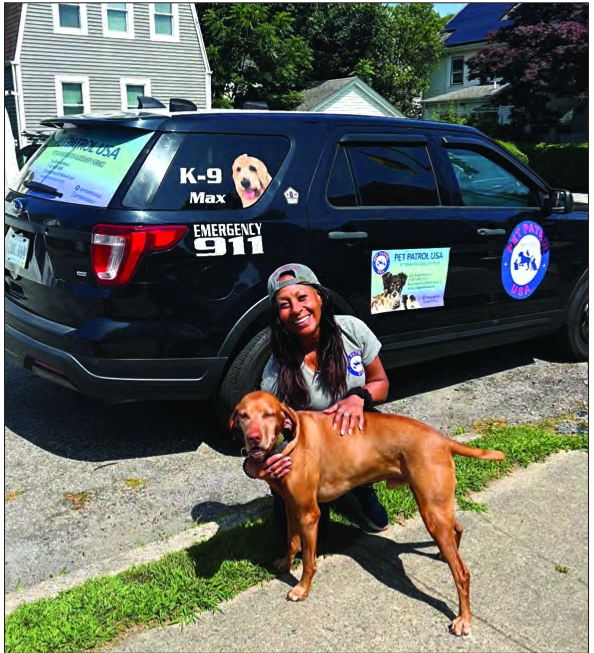 Pet Patrol owner Lisa Berry Barbosa and friend pose next to one of her transport vehicles — a retired SUV police canine car.