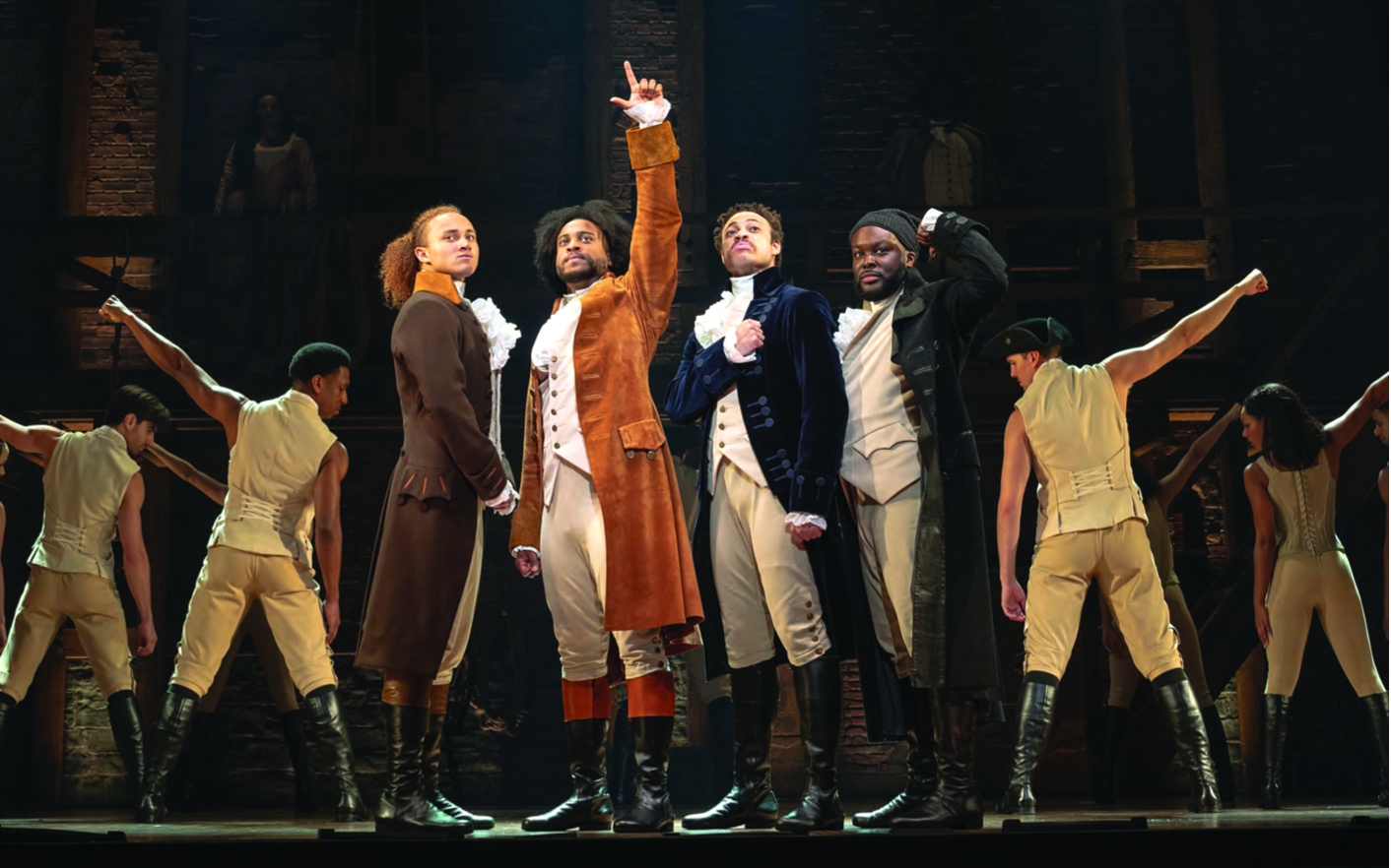 From left: Nathan Haydel, Tyler Fauntleroy, Jared Howelton, Elvie Ellis and Company in “Hanilton” National Tour