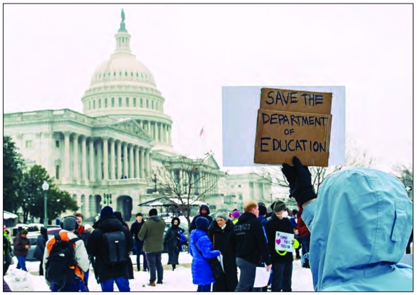 A demonstrator holds a sign supporting the Department of Education during a Capitol protest.