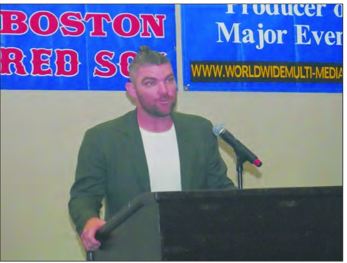 Red Sox pitcher and Louis Tiant Courage Award winner, Liam Hendricks, addresses the crowd.