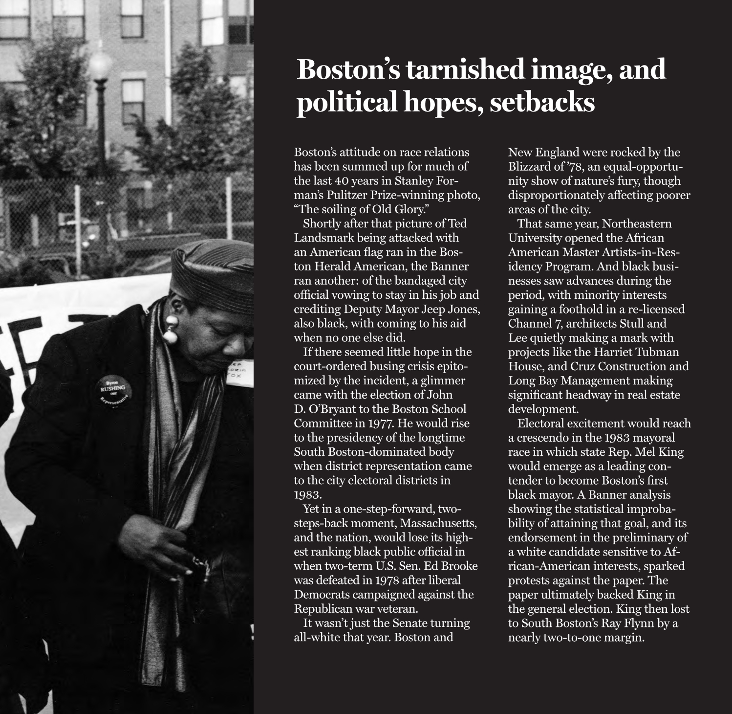 Shortly after that picture of Ted Landsmark being attacked with an American flag ran in the Boston Herald American, the Banner ran another: of the bandaged city official vowing to stay in his job and crediting Deputy Mayor Jeep Jones, also black, with coming to his aid when no one else did.