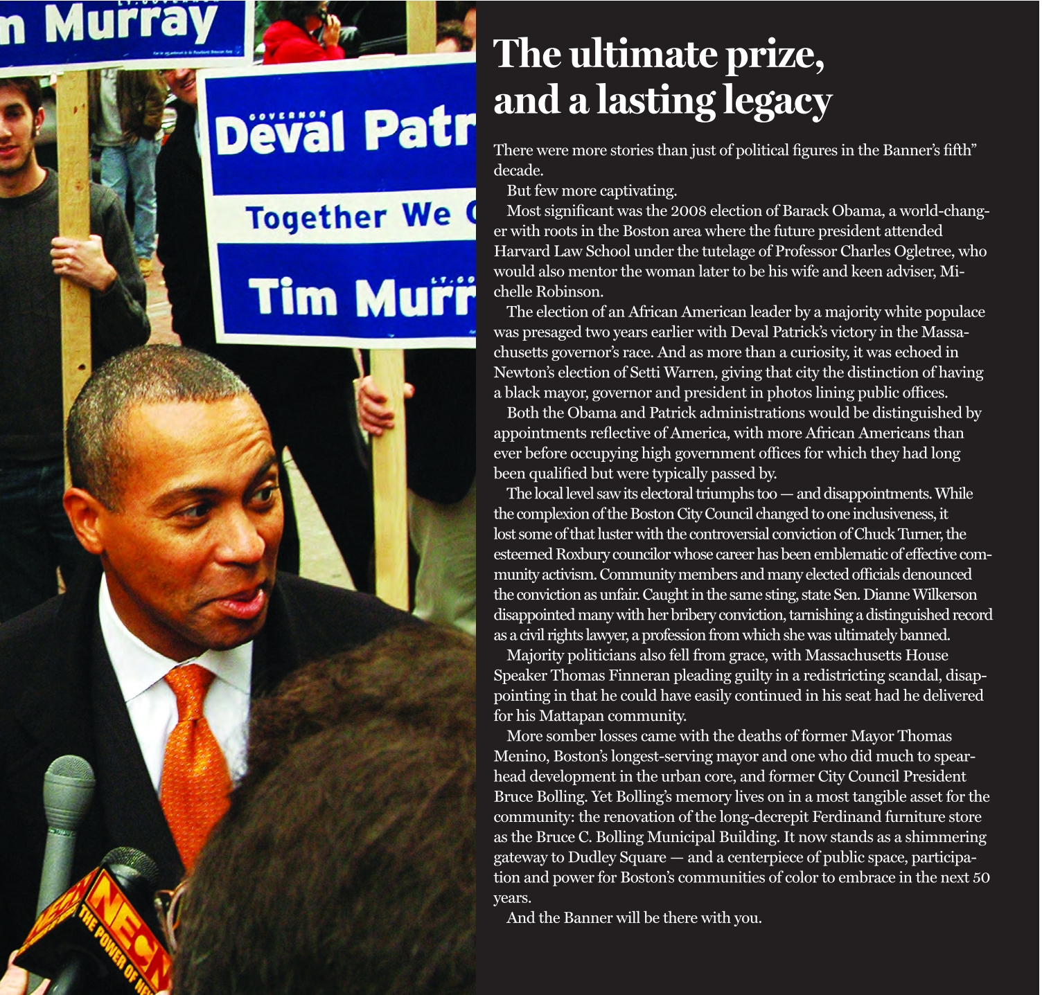 The local level saw its electoral triumphs too — and disappointments. While the complexion of the Boston City Council changed to one inclusiveness, it lost some of that luster with the controversial conviction of Chuck Turner, the esteemed Roxbury councilor whose career has been emblematic of effective community activism. Community members and many elected officials denounced the conviction as unfair. Caught in the same sting, state Sen. Dianne Wilkerson disappointed many with her bribery conviction, tarnishing a distinguished record as a civil rights lawyer, a profession from which she was ultimately banned.